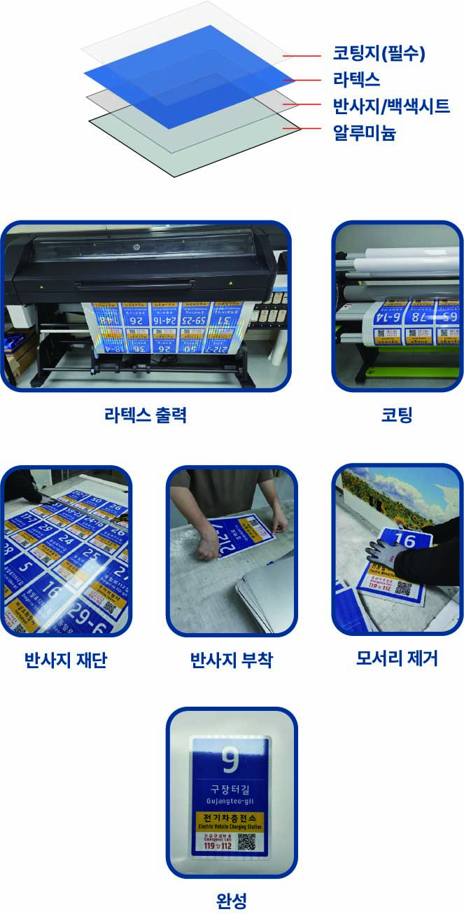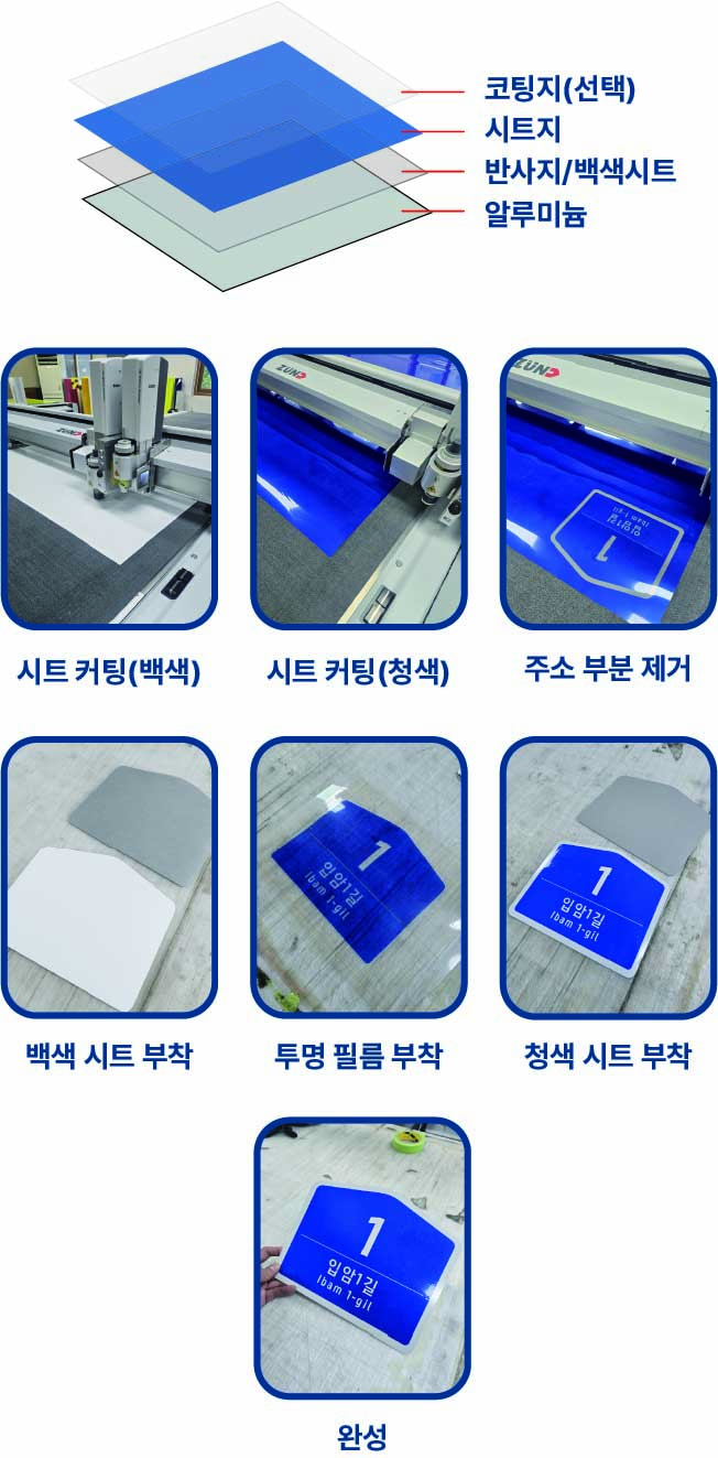 이 방식은 알루미늄판 위에 반사지 또는 배경 시트를 부착한 후, 주소 문구를 표현할 시트를 커팅하여 부착하는 방법이다.