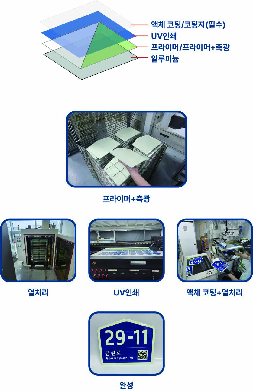 도로명판, 건물번호판, 기초번호판, 사물주소판 등 다양한 주소정보시설의 제작에는 여러 가지 방식이 적용된다.