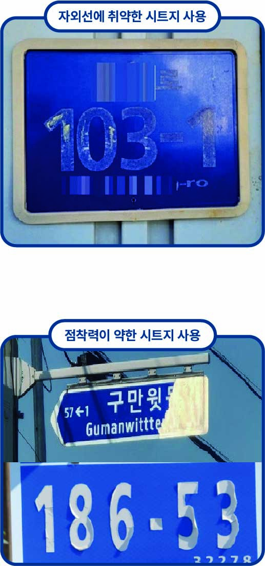 실제로 햇빛이 강한 환경에 설치된 시설물은 짧은 기간 내에도 색상이 바래거나 지워져 가독성이 현저히 저하되는