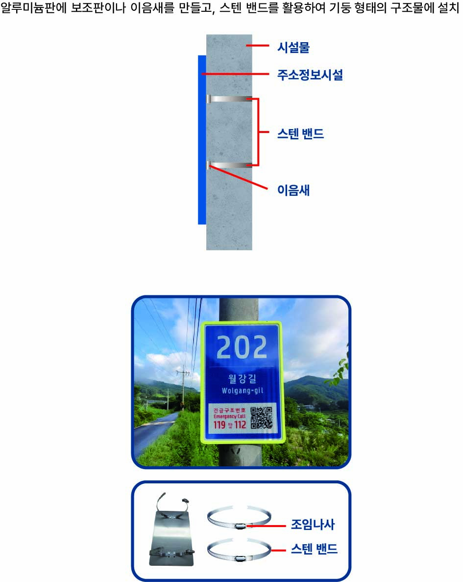 설치 과정은 간단하다. 먼저 주소정보시설의 뒷면에 보조판을 부착하거나 이음새를 형성한다. 이후 이음새에 스테인리스 밴드를 삽입하여