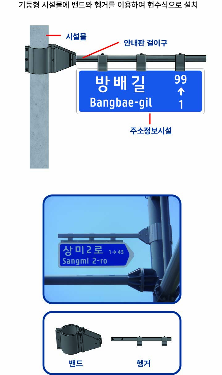 이때 사용되는 주요 부품은 밴드와 헹거로, 기둥을 밴드로 단단히 고정한 후 헹거를 이용하여 도로명판을 매달아 설치하는 구조이다.