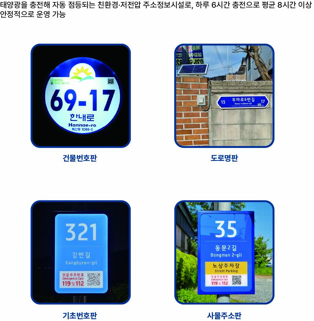 그 대표적인 사례로 태양광 LED 내부조명형 주소정보시설을 들 수 있다. 본 제품은 주간에 태양광을 흡수하여 전력을 생산하고,