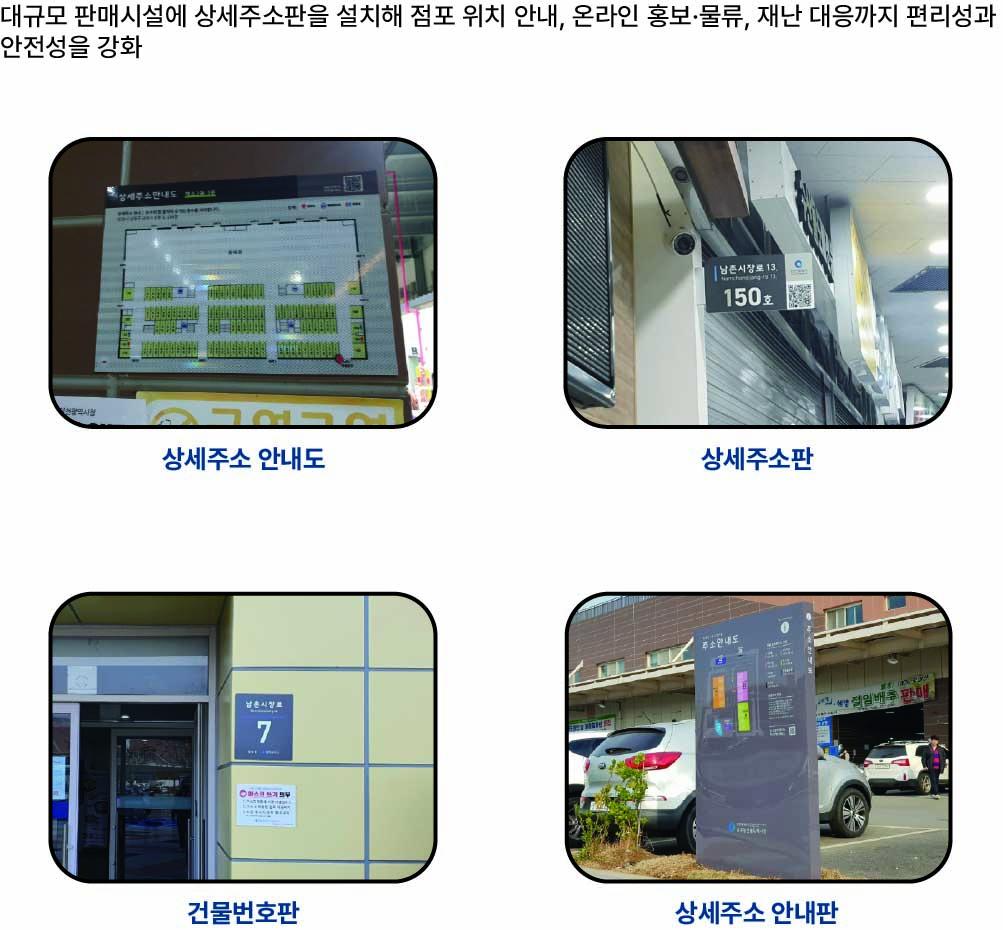 이와 같은 문제를 해결하기 위하여 시장 전역에 상세주소가 부여되고, 점포별로 주소정보시설(상세주소판)이 체계적으로 설치되었다.