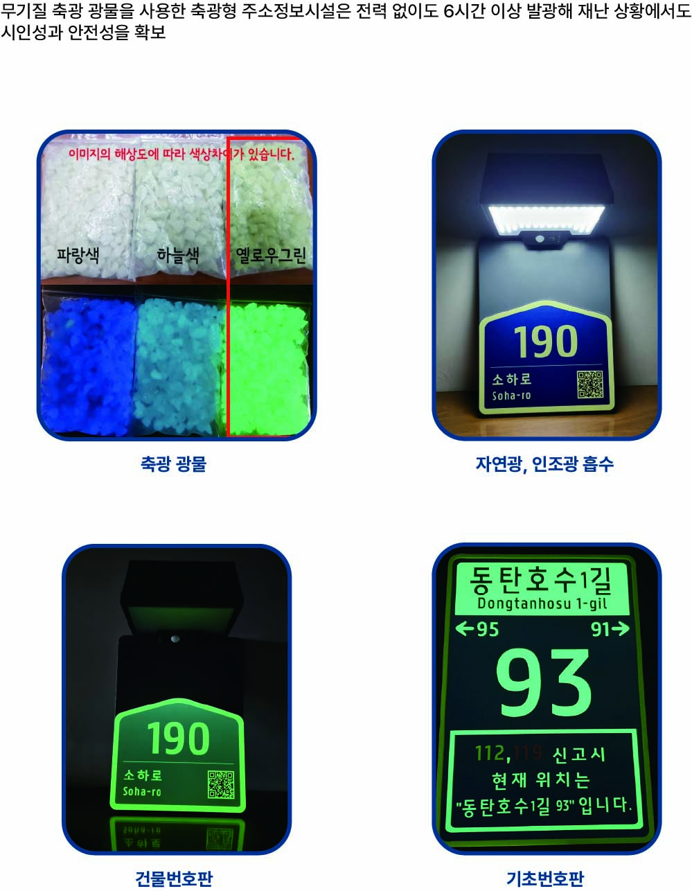 축광형 주소정보시설은 실내 전용으로 개발된 제품으로, 태양광뿐만 아니라 수은등·형광등·백열등 등 일상적인 조명 빛을 흡수하여 에너지를 저장하고,