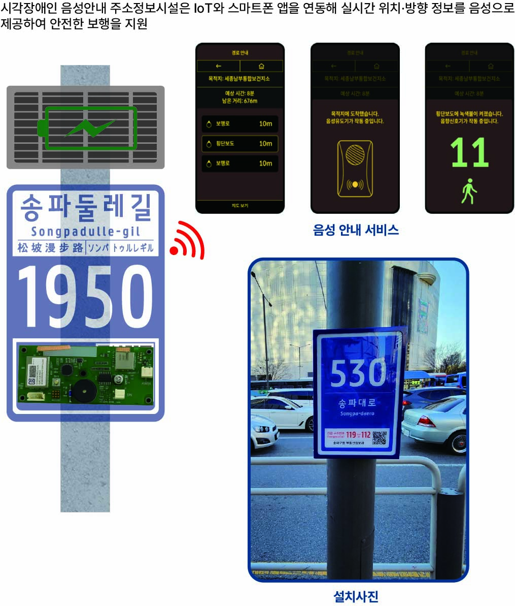 시각장애인 음성안내 주소정보시설은 태양광 주소정보시설과 IoT 음성유도기를 결합하여 스마트폰 애플리케이션과